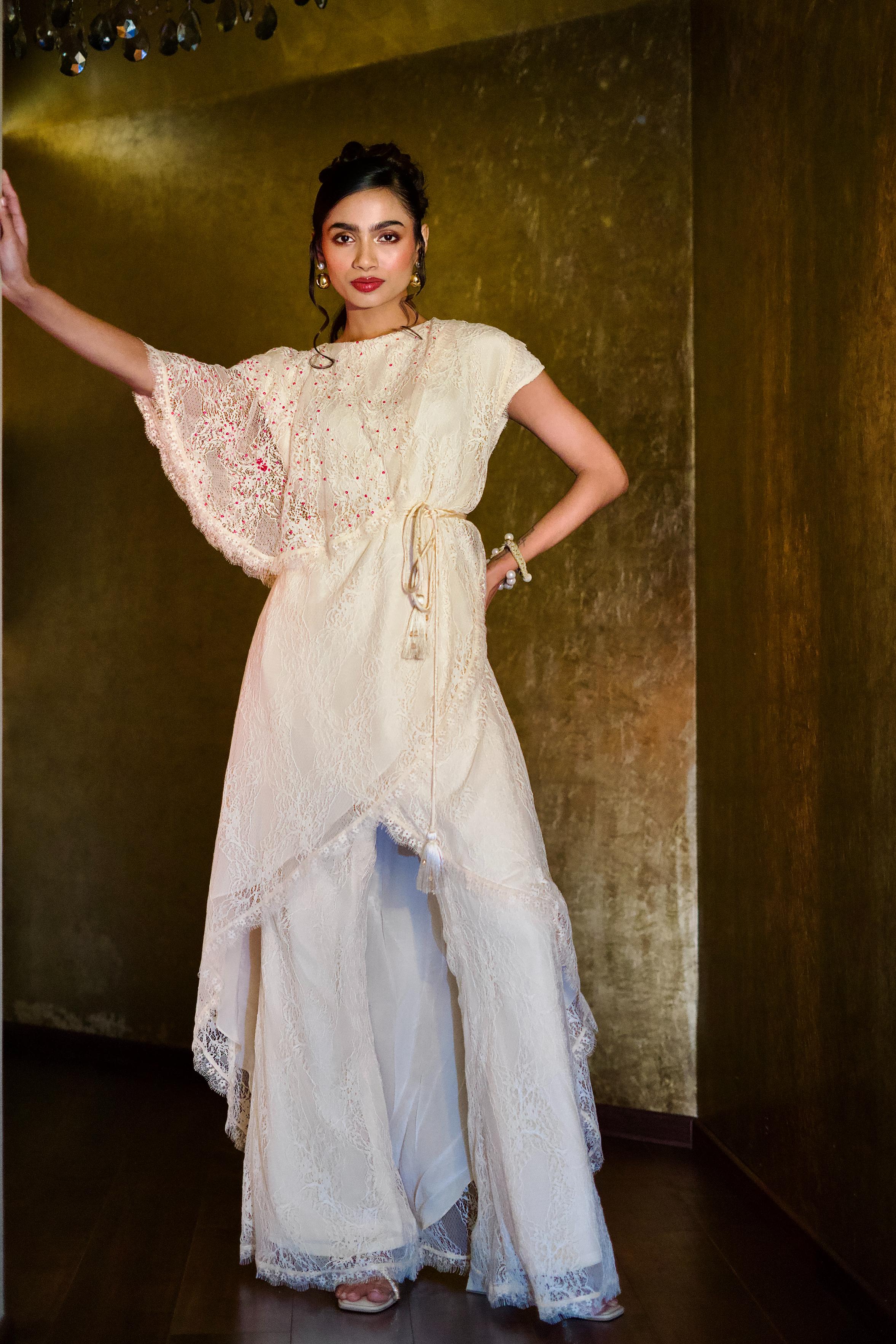 Bring retro chic to the forefront with our Ivory Lace Bell Bottom Pants. Featuring intricate lace detailing, these flares add romance and elegance to your festive style. Designed to move with you, these pants ensure you own the spotlight at every celebration.