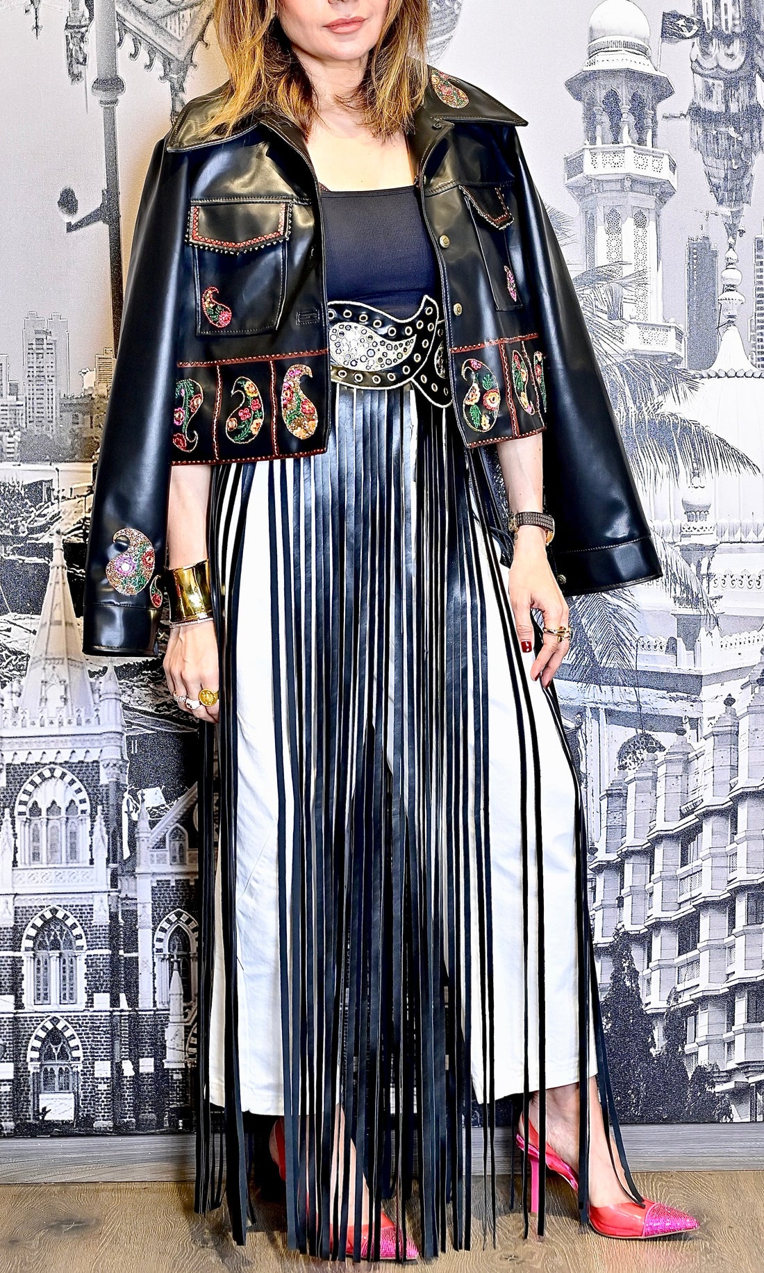 BLACK LEATHER EMBROIDERED PAISLEY FRINGE BELT