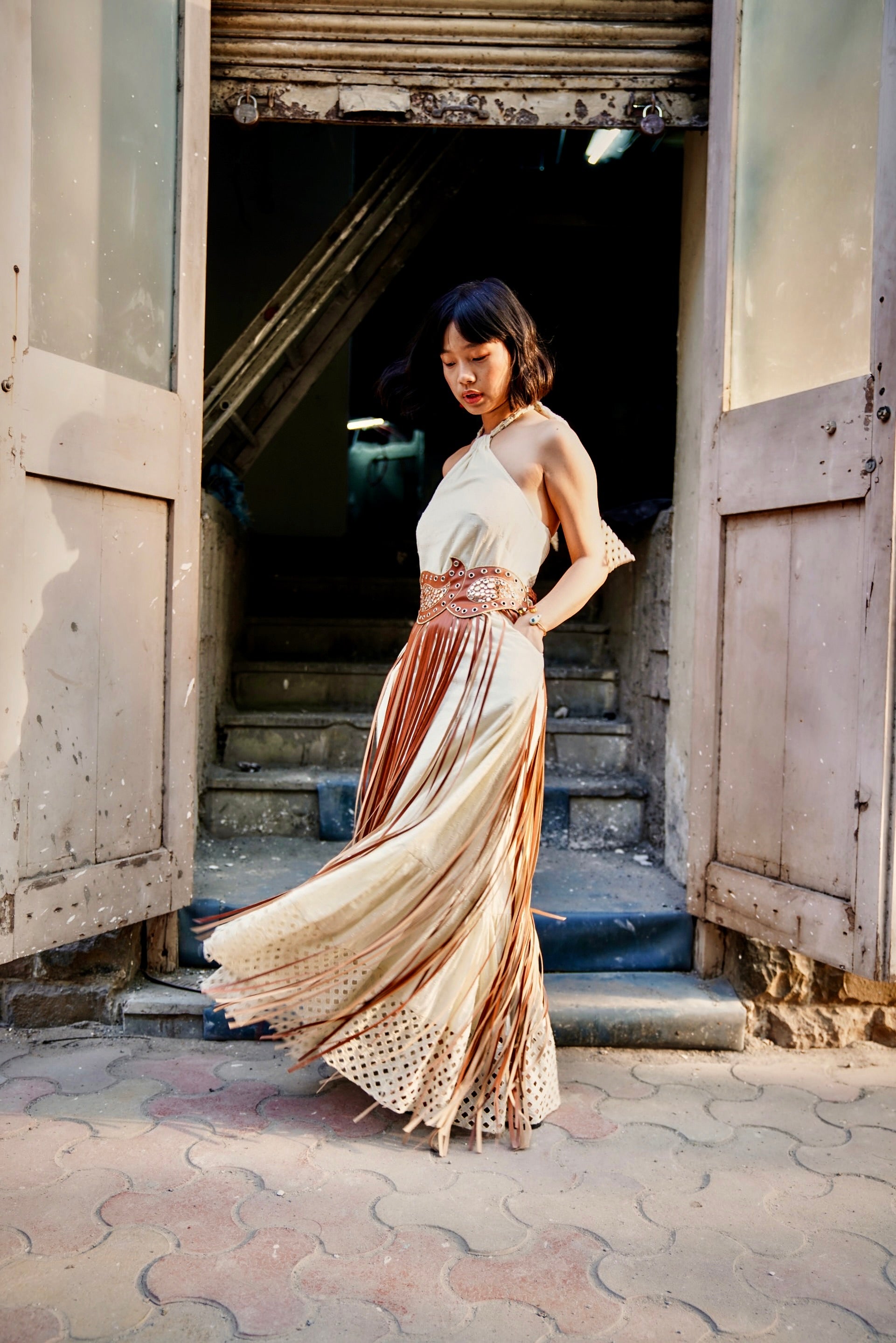 TAN LEATHER EMBROIDERED PAISLEY FRINGE BELT