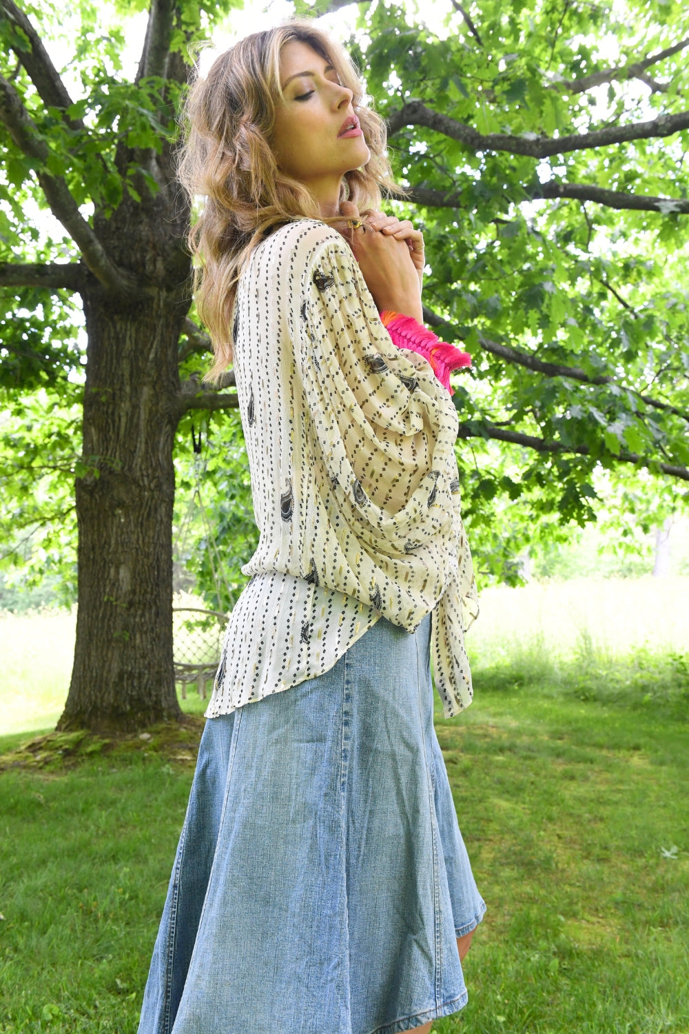 Ready-to-wear for the bold and fascinating. This black & white Bandhani kimono shirt in sheer chiffon with gold butt texture is your go-to for festive or boho styling. Its lightweight, airy fabric ensures comfort, while the intricate Bandhani design adds a touch of traditional elegance. Perfect with flared pants for a festive feel or skirts for boho chic. Effortless style for the woman ready to make a statement.
