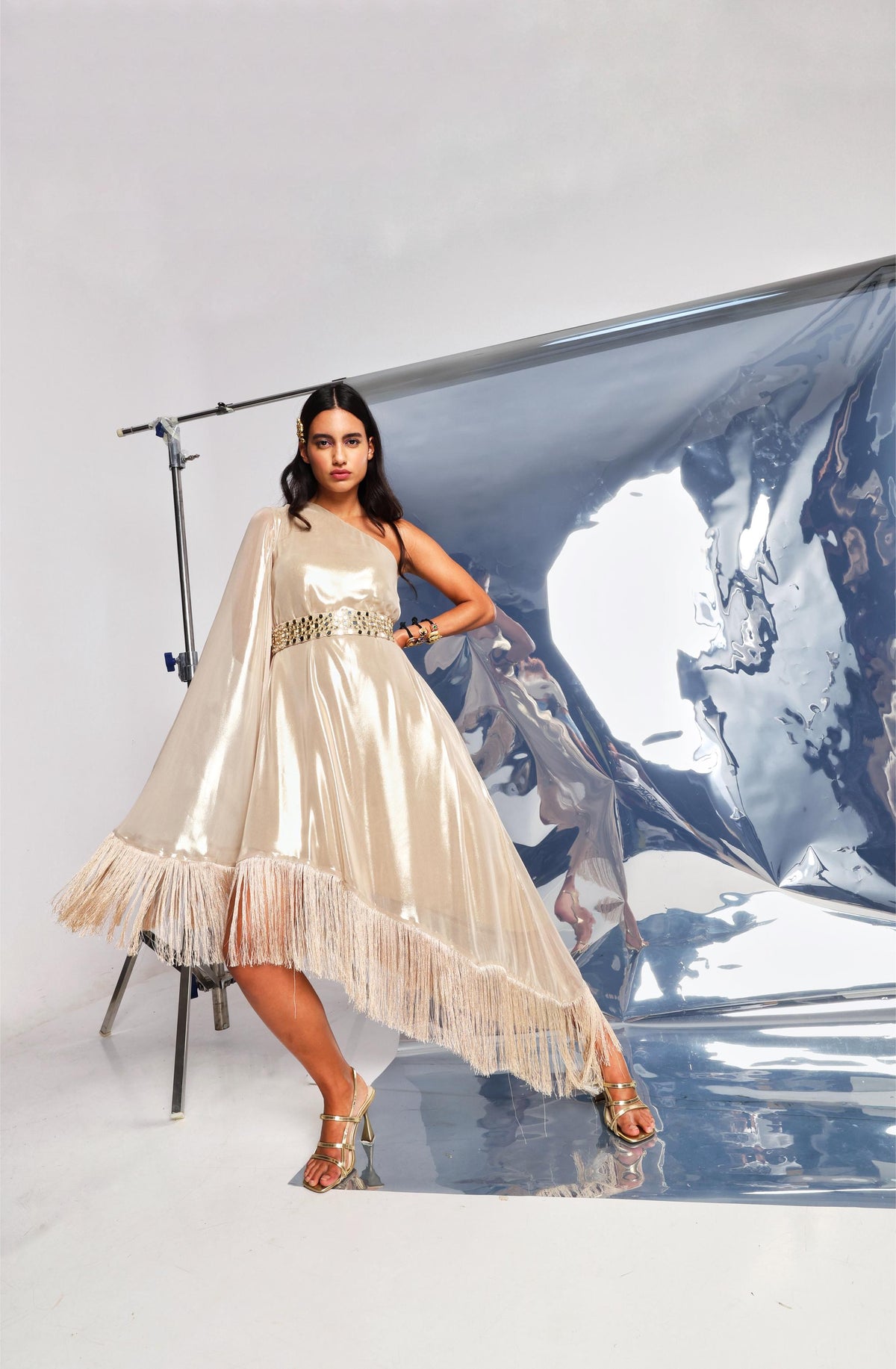 Whether you're attending a red-carpet event, a cocktail party, or a special celebration, this one-shoulder dress is your go-to for making a bold and unforgettable statement. The metallic gold fabric catches the light beautifully, ensuring you'll shine bright all night long. Pair this show-stopping dress with minimal accessories to let the metallic gold take center stage. Opt for sleek heels, a chic clutch, and a statement earring on the opposite side of the cape sleeve for a perfectly balanced and effortlessly glamorous look.