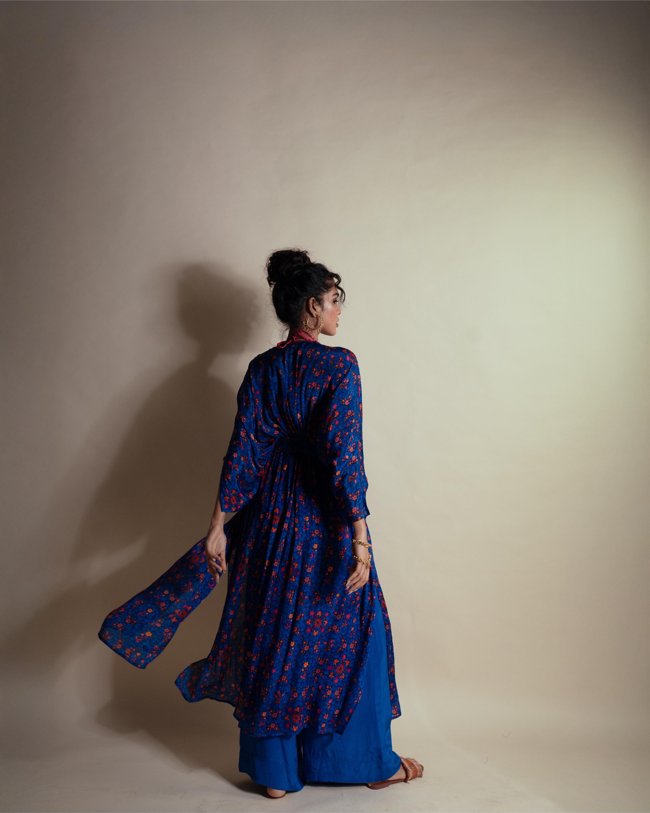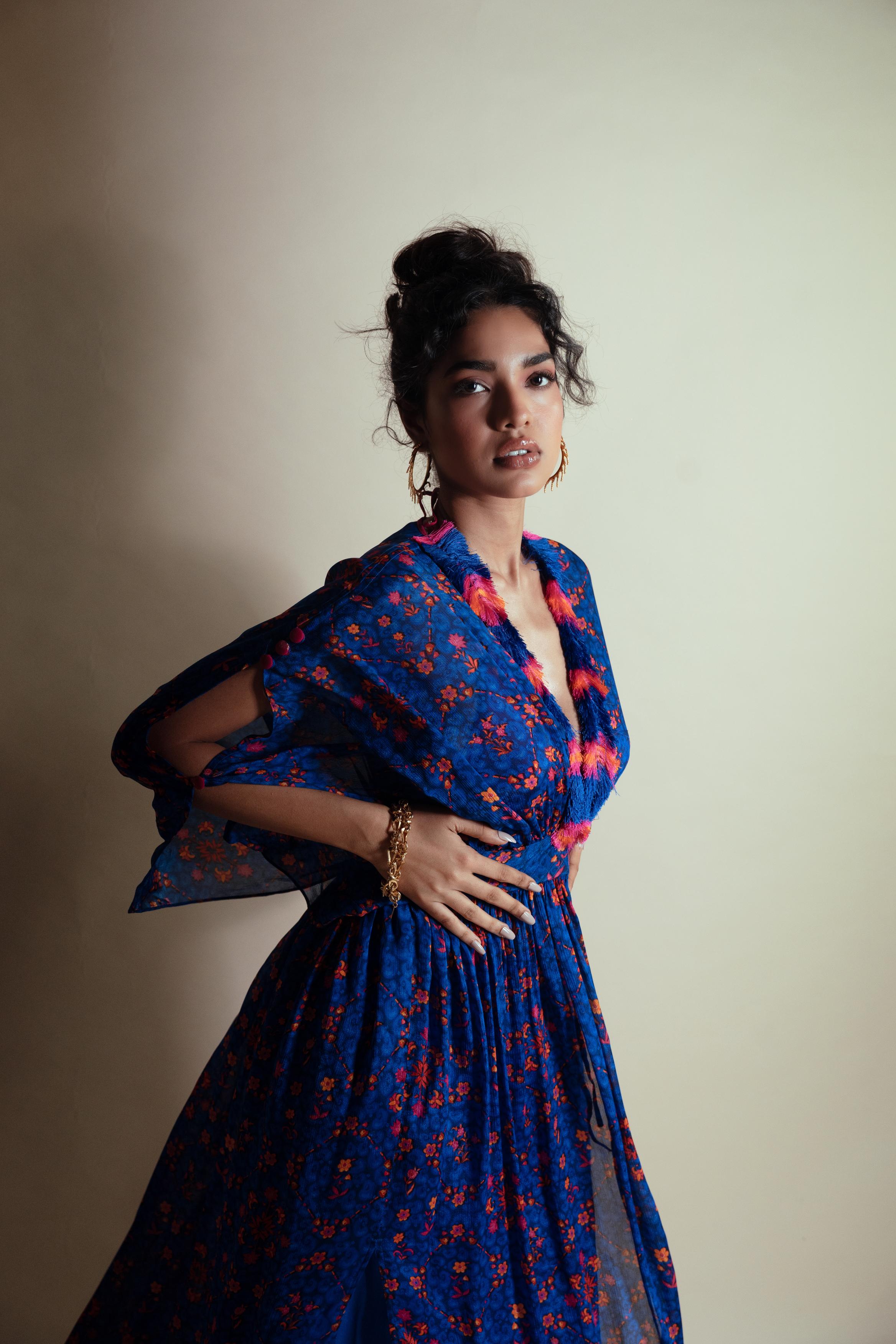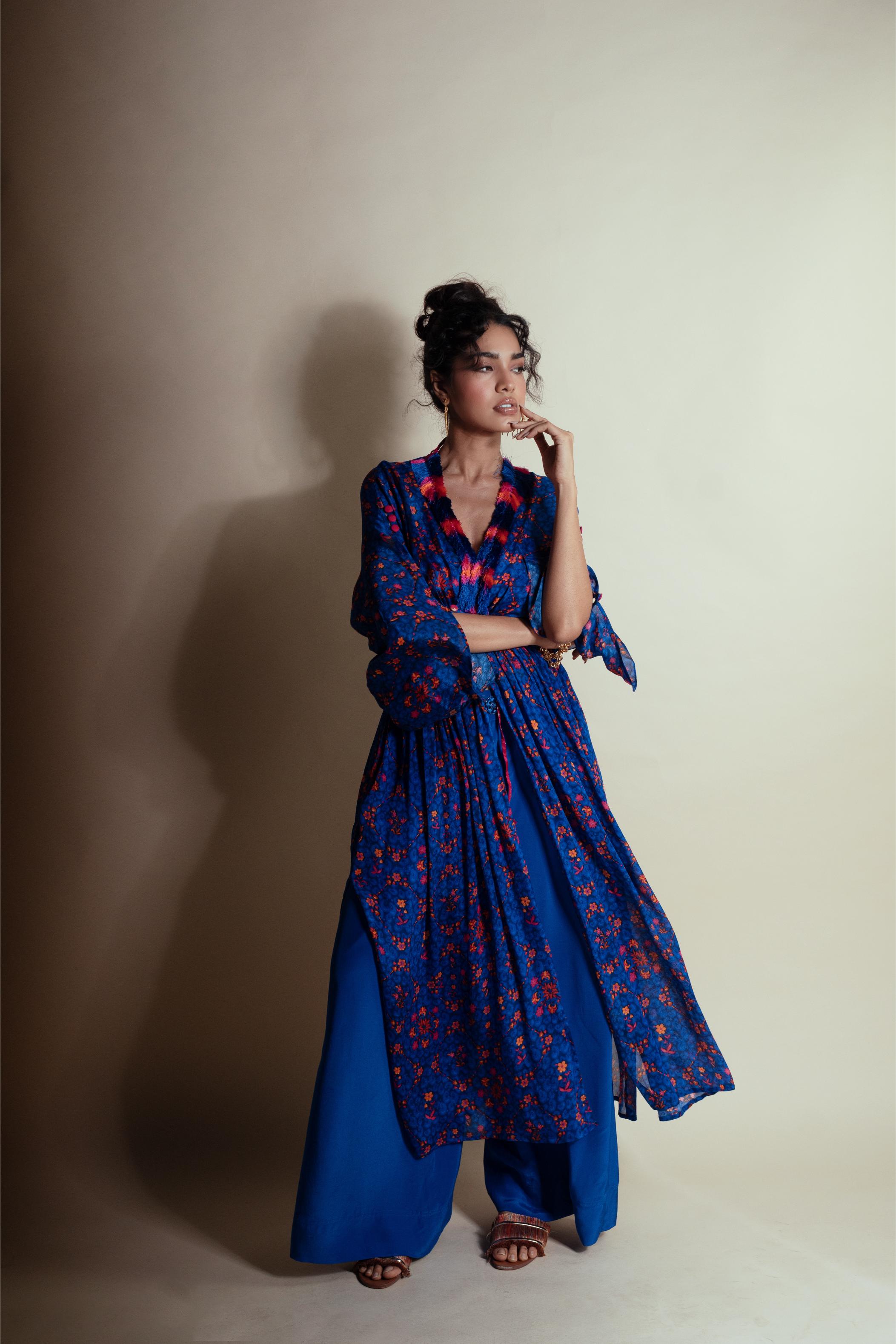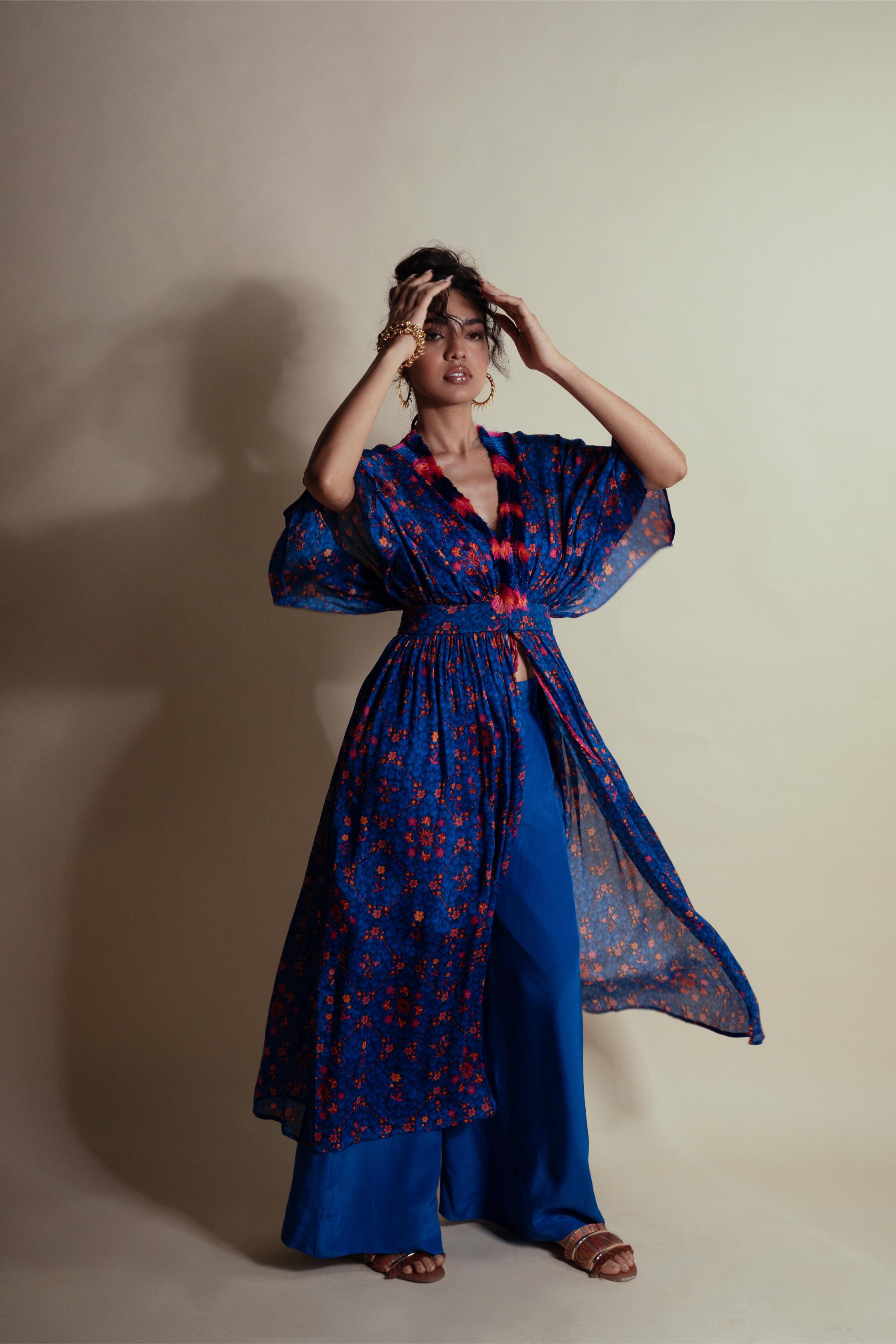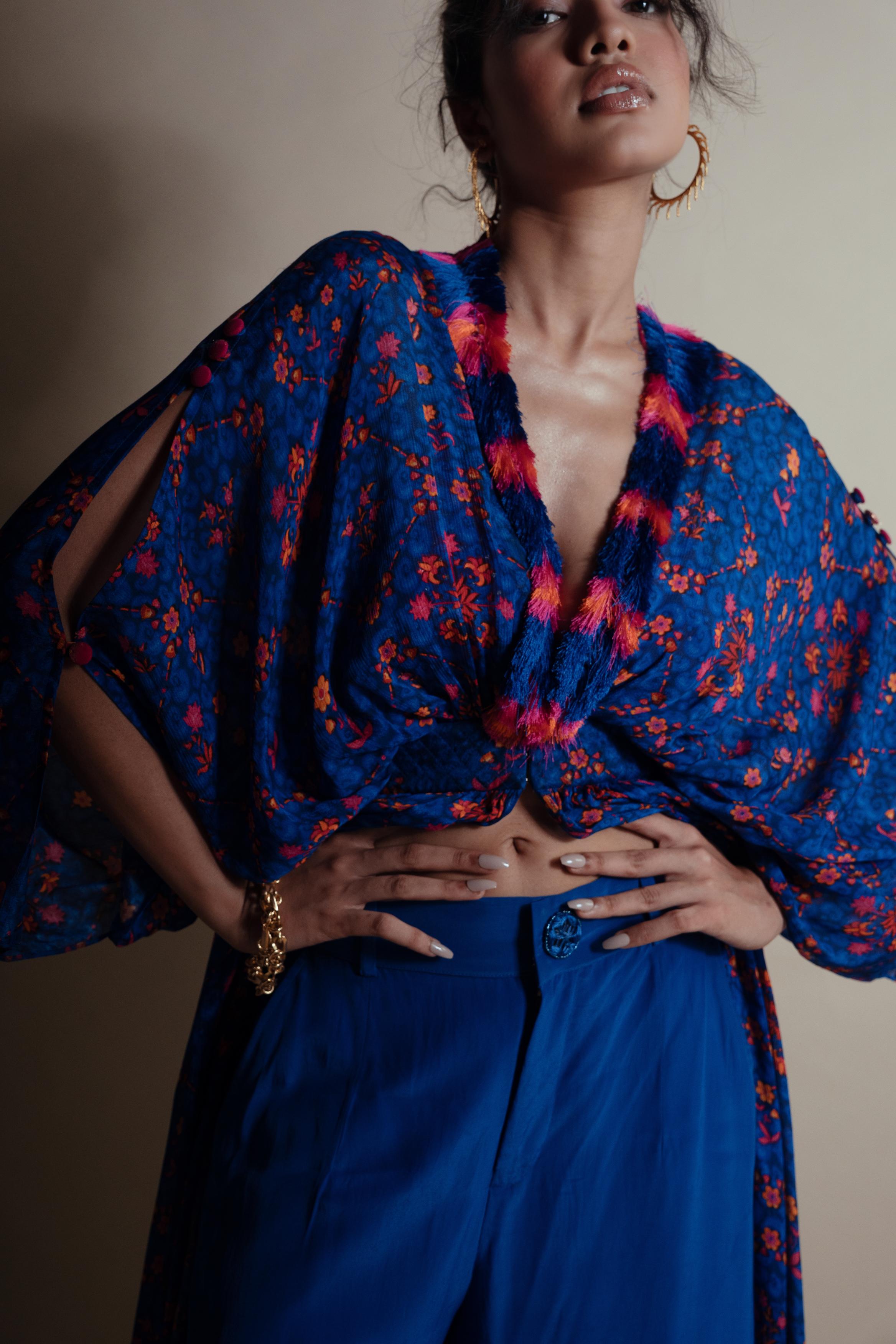Soft blooms, bold style. Made from lightweight chiffon, this cobalt blue duster features a delicate flower print and kimono-style sleeves with colorful tassel details. The quilted belt cinches at the waist, giving you shape while the flowy chiffon flare at the bottom adds movement. Perfect for pairing with denim, a mini slip dress, or shorts — whether you’re brunching by the beach or strolling into summer nights, this duster brings effortless flair to any look.