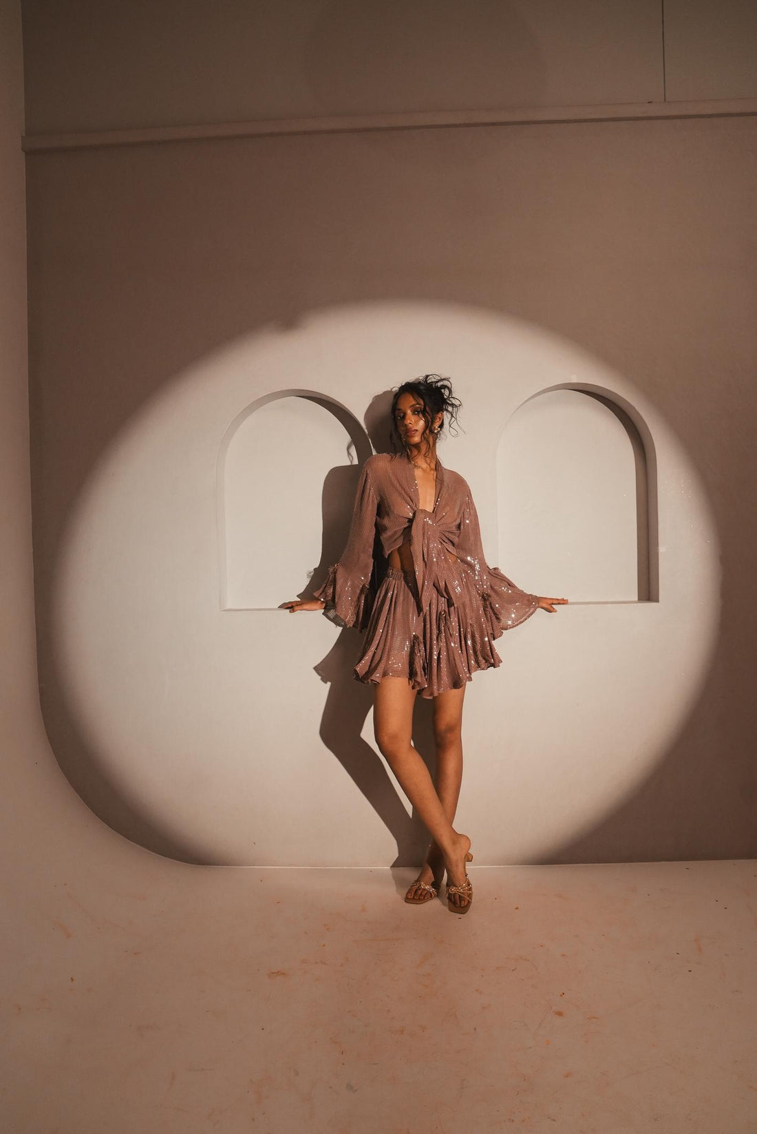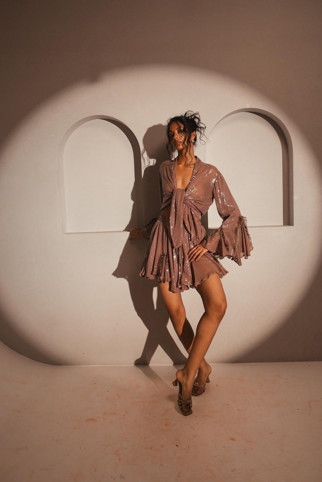 These godet skorts offer the elegance of a skirt with the practicality of built-in shorts. Each godet is adorned with exquisite embroidered mirrors, adding a touch of sparkle to every movement. The comfortable shorts beneath ensure you can dance and enjoy the party with ease, making these skorts the perfect choice for both lively parties and after-parties. Wear it with our MORGANITE SEQUINS SHRUG for a coordinated look.