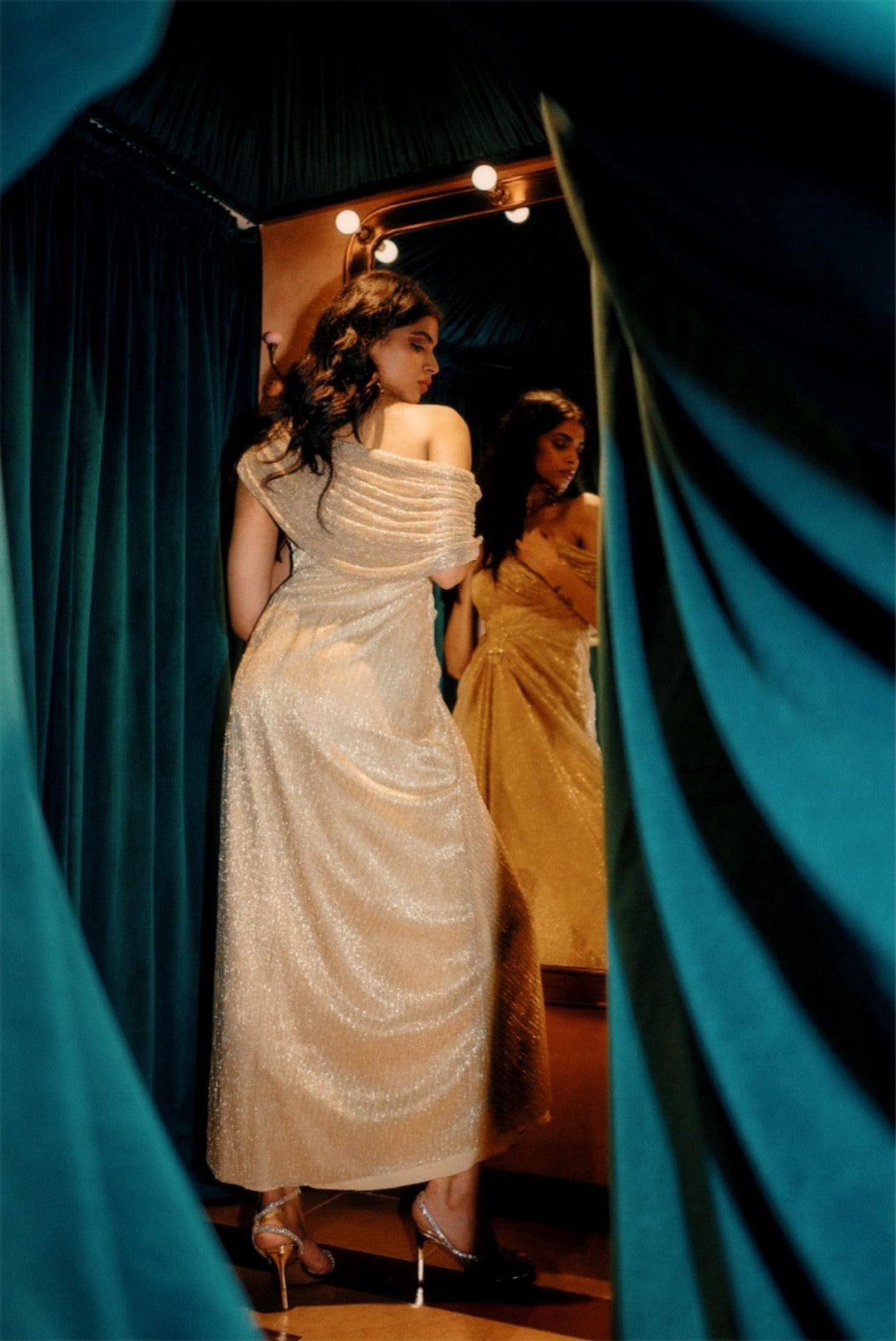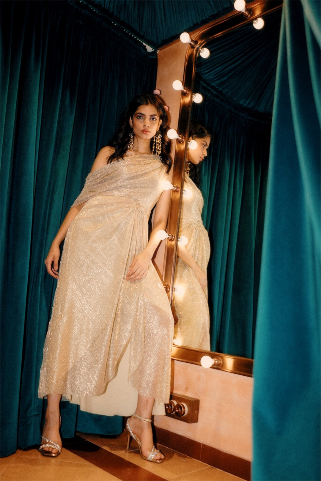 Style it with strappy heels, a sleek clutch, and statement earrings to amplify the glam factor. With its dazzling details and versatile silhouette, the Sparkling Gold Drape Dress ensures you own the night, wherever it takes you.